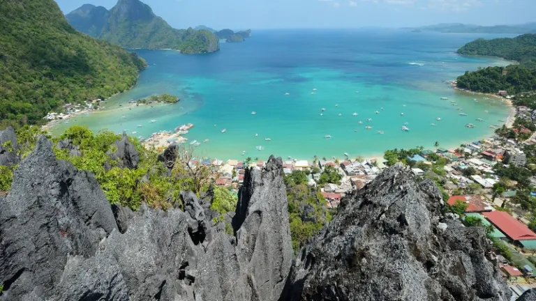 Berjarak sekitar 6 jam dari ibu kota, El Nido adalah destinasi paling populer dengan pemandangan laguna biru dan tebing karst yang menjulang tinggi.