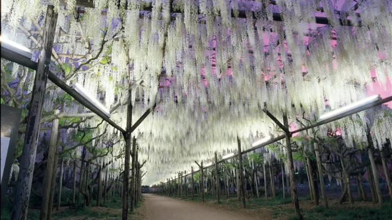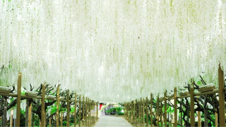 Selain si pohon raksasa, kamu juga bisa menemukan lorong bunga wisteria putih sepanjang 80 meter yang menawan. Cahaya matahari yang menembus celah-celah bunga putih bersih ini menciptakan efek visual yang cantik untuk diabadikan di kamera.