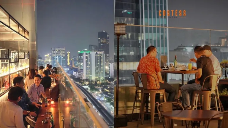 Ingin menikmati senja Jakarta dari ketinggian? COSTESS yang terletak di gedung Cyber 2, Kuningan, menawarkan area rooftop yang memukau. Bar ini terkadang jadi pilihan pekerja kantoran di sekitar Kuningan sebagai tempat minum setelah santai sehabis bekerja. Suasananya terbuka dan berangin, memberikan jeda yang menyegarkan dari pengapnya ruangan ber-AC. Harganya pun terbilang standar untuk ukuran bar di kawasan bisnis pusat. Pilihan alkoholnya bervariasi, mulai dari cocktail klasik, wine, whisky, gin, tequila, dan masih banyak lagi.