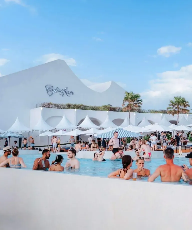 Café del Mar, yang identik dengan putih-biru ala Ibiza, memiliki kolam renang infinity yang luas dan arsitektur bergaya Mediterania. Suasananya chic, santai, dan merdu, dengan fokus utama pada musik lounge, sempurna bagi mereka yang ingin bersantai dan menikmati waktu bersama teman-teman.