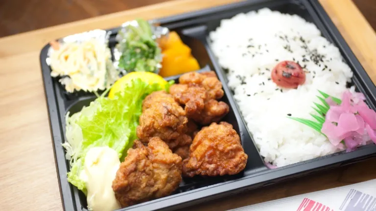 Menu klasik yang pasti cocok di lidah. Berisi ayam goreng tepung renyah bersertifikat halal, nasi, acar sayuran, tamagoyaki (telur dadar gulung), lauk musiman, dan hidangan penutup kecil.
