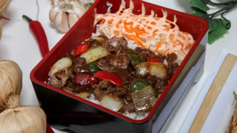 Ini adalah menu favorit yang sering ludes terjual! Isinya irisan daging sapi panggang berbumbu khas Jepang, nasi hangat, sayuran wijen, rumput laut, dan kroket kentang halal.