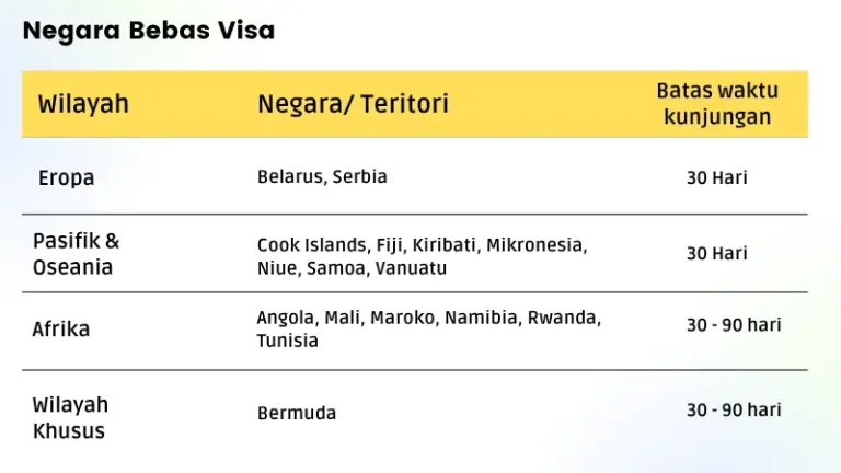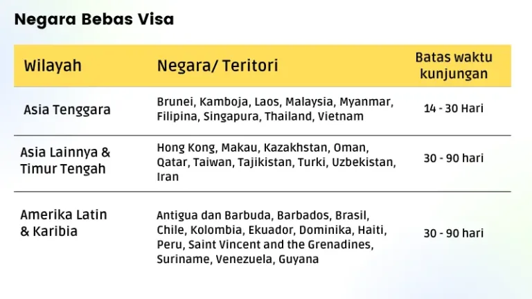 Agar lebih mudah merencanakan perjalananmu, berikut adalah daftar lengkap negara-negara yang memberikan kemudahan masuk bagi WNI, dibagi berdasarkan jenis izin yang dibutuhkan: