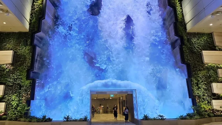 Begitu check-in, kamu bakal disambut oleh The Wonderfall. Ini adalah layar raksasa setinggi 14 meter yang menampilkan air terjun digital. Visualnya saking jernihnya, sampai-sampai terlihat seperti air beneran yang pecah saat melewati pintu-pintu di sana. Aku sempat duduk lama di sini cuma buat bengong melihat alirannya, beneran menenangkan!