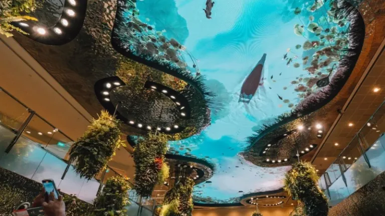 Selanjutnya ada Dreamscape. Ini adalah perpaduan instalasi taman mini dengan teknologi digital tingkat tinggi. Di langit-langitnya ada layar yang menampilkan pemandangan langit atau bagian bawah sungai. Uniknya, lantainya transparan! Jadi saat kamu berjalan di atasnya, kamu seolah mengambang di atas kolam ikan. Anak-anak pasti bakal betah banget di sini karena rasanya seperti jalan di atas air. Lokasinya dekat dengan Gate F, area transit setelah imigrasi.