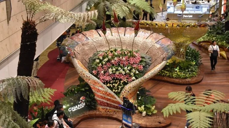 Masih di Terminal 2, ada Enchanted Garden. Ini adalah surga buat pecinta bunga. Taman ini interaktif, lho! Ada sensor gerak yang memicu suara alam dan lampu LED saat kamu berjalan melewati jalur bergelombangnya. Di tengahnya ada empat patung buket kaca raksasa yang berkilauan. Suasananya benar-benar seperti di negeri dongeng atau Shangri-La.