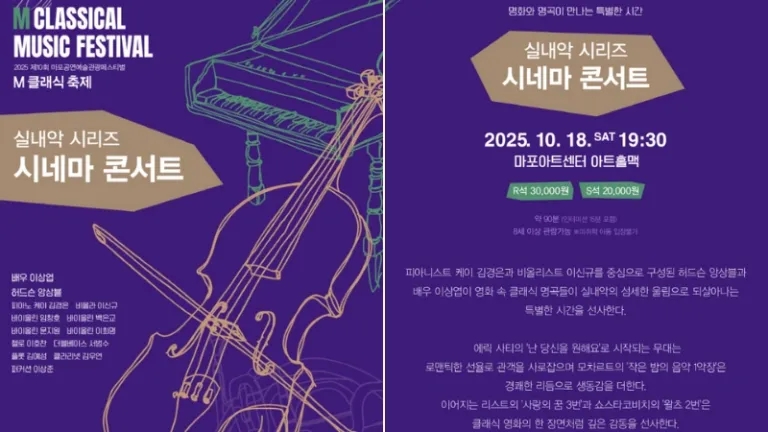Nikmati perpaduan menawan antara film dan musik secara langsung di Cinema Concert pada Mapo M Classic Festival. Hudson Ensemble, menampilkan pianis Kay Kyung Eun Kim dan violis Steve Lee, akan membawakan skor film ditemani visual di layar lebar. Malam yang elegan dan sempurna bagi para pecinta sinema dan simfoni.