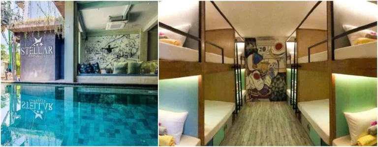 Stellar Capsules di Seminyak menawarkan kamar asrama dengan harga terjangkau dan privasi yang lebih baik ketimbang saat kamu di kamar tidur biasa. Selain itu, terdapat kolam renang yang teduh dan teras di setiap kamar!
