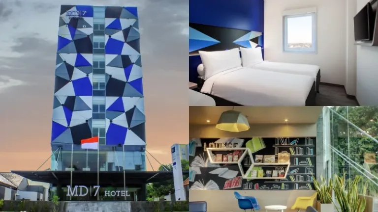 Buat penyuka desain unik, dinding mozaik biru-abu di MD7 Hotel pasti bikin kamu tertarik. Jaraknya sekitar 500 meter dari stasiun (6 menit jalan kaki).