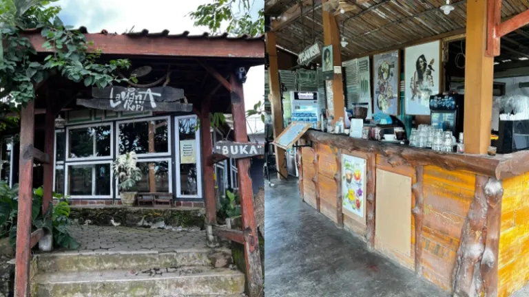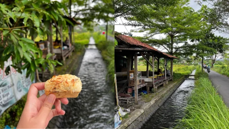 Makan kue balok di tepi sungai kecil di bawah pohon sambil memandang hamparan sawah, ini adalah view yang jarang dilihat di kota besar. Kedai Kopi & Kue Balok Kang Sute menyajikan suasana syahdu yang sangat menenangkan.