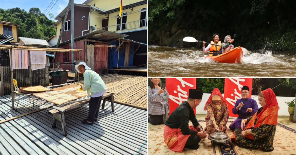 Di awal perjalanan saya mencicipi kek lapis Sarawak (kue lapis Sarawak) yang dikenal dengan penuh warna di setiap lapisannya. Sambil menikmati kek lapis dan minuman segar ini, kami dihibur dengan pertunjukan langsung tari tradisional Iban yang indah dengan alunan musik sape.