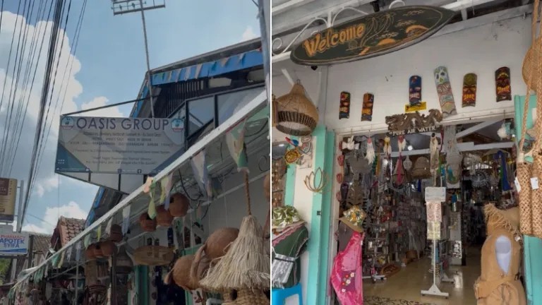 Masih di kawasan yang sama, mata saya langsung tertuju pada toko bernama Oasis Group. Dari luar saja sudah terlihat estetik dengan gantungan lampu dari anyaman bambu dan baju-baju pantai. Masuk ke dalamnya, suasananya persis seperti toko kerajinan di pinggir pantai.