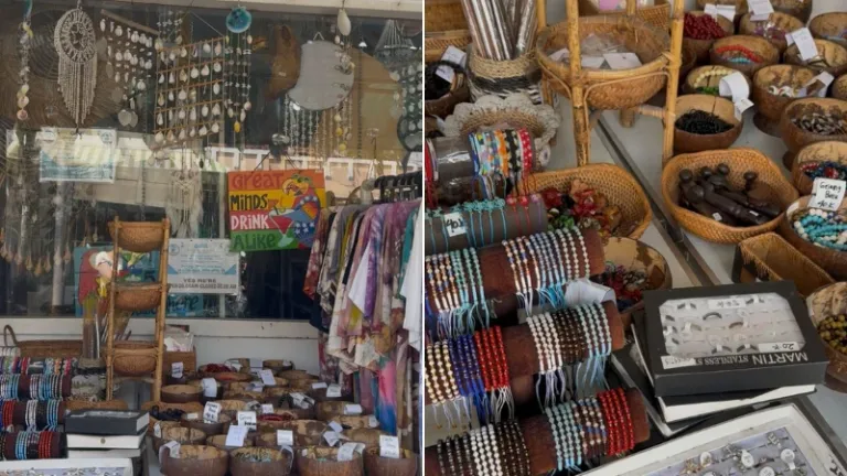 Ada banyak dream catcher, kerajinan dari kerang, topi rajut, sampai perhiasan buatan tangan. Koleksinya sangat banyak dan padat, jadi kamu harus sabar menjelajahi dari satu rak ke rak lainnya untuk menemukan harta karun yang paling kamu suka.