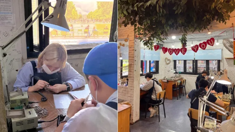 Banji Cafe melangkah lebih jauh dari sekadar tempat minum kopi dengan menawarkan pengalaman membuat perhiasan sendiri, seperti cincin, kalung, dan gelang. Tren perhiasan custom ini meledak setelah selebriti Korea, Gain dan Jo Kwon, membuat cincin pasangan mereka di acara We Got Married. Kamu bisa memilih material perak murni dengan berbagai pilihan lapisan warna (hitam, putih, pink, atau kuning) serta menambahkan batu permata atau grafir laser sesuai keinginan. Sambil menunggu karyamu selesai diproses, kamu bisa menikmati secangkir kopi di area rooftop-nya yang asyik.