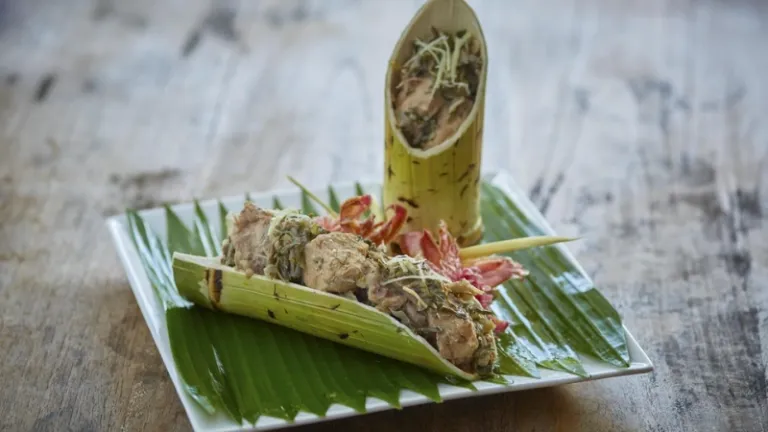 Jangan lewatkan Ayam Pansuh, alias Manok Pansuh, hidangan ayam bambu unik yang hanya bisa ditemukan di Sarawak. Hidangan ini adalah hidangan khas yang disiapkan suku Iban, Bidayuh, dan suku asli lainnya, terutama saat perayaan tahunan seperti Gawai Dayak (Festival Panen). Hidangan ini dibuat dengan memasak ayam yang dicampur dengan perpaduan bumbu seperti bawang putih, jahe, serai, bawang merah, bunga kantan, dan cabai dalam batang bambu yang berlubang, dibumbui dengan garam, bumbu bubuk, dan daun tapioka. Ayam dalam batang bambu kemudian dipanggang di atas api.