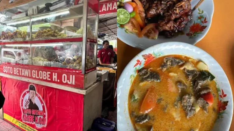 Di belakang area Metro Atom Plaza Pasar Baru, kamu bisa menemukan tempat makan soto Betawi yang enak bernama Soto Betawi Globe H. Oji. Meskipun tempat makannya sederhana berupa tenda, pengunjungnya selalu ramai sampai antre—tapi tenang, pelayanannya cepat dan sigap. Kuah sotonya menggunakan santan creamy dan diperkaya sentuhan rasa pedas, potongan tomat, dan taburan emping. Kamu bisa memilih isian soto mau full daging atau campur dengan jeroan.