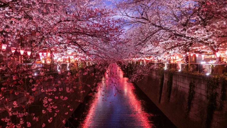 Lampu-lampu yang dipasang di sepanjang sungai menyinari kelopak bunga sakura yang pucat, memberikan kilau lembut yang sangat romantis. Berjalan-jalan di sini saat malam hari bakal jadi pengalaman yang nggak terlupakan, apalagi kalau kamu datang bareng pasangan atau teman-teman.