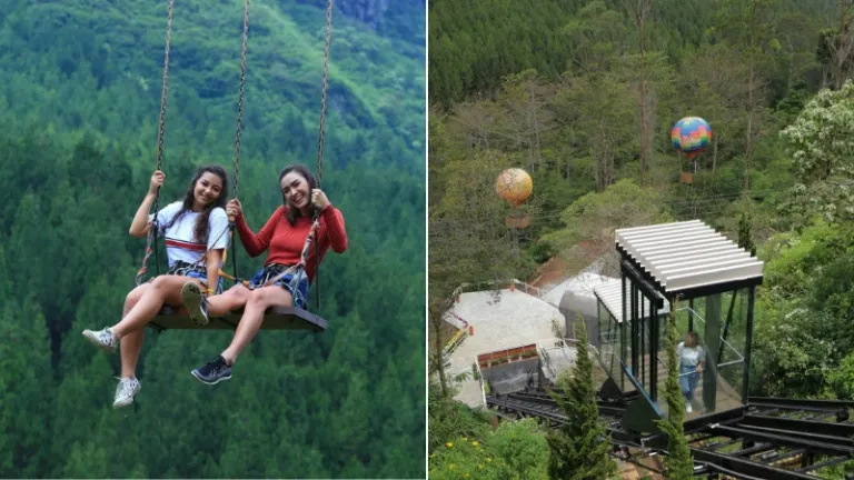 Bisa dikatakan The Lodge Maribaya adalah pionir wisata foto ekstrem di Bandung yang hingga kini tetap menjadi pilihan utama wisatawan. Kamu bisa mencoba berbagai wahana foto ikonik seperti balon udara statis, ayunan langit, hingga bersepeda di atas tali dengan pemandangan hutan pinus. Ada pula funicular yang membuatmu dapat melihat area The Lodge yang hijau dari ketinggian.