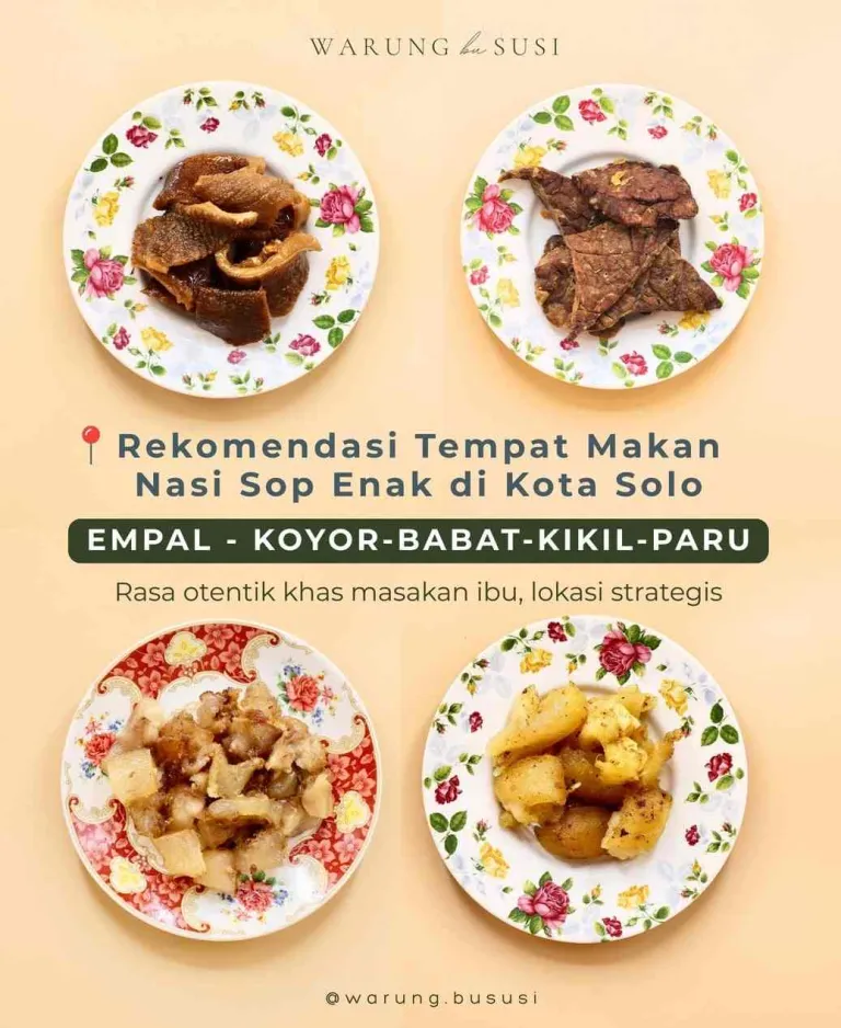 Namanya warung, tapi Warung Bu Susi Kalitan ini serupa rumah makan dengan menu yang lengkap. Solo memang punya banyak menu soto dan itulah salah satunya yang tersedia di sini. Nikmati nasi sop untuk sarapanmu, dan tidak akan membosankan karena banyak jenisnya. Misalnya nasi sop koyor yang berisi urat sapi, nasi sop babat, nasi sop paru dan nasi sop empal. Untuk teman makanmu, pesanlah sosis solo yang berisi daging ayam yang kenyal dan gurih.