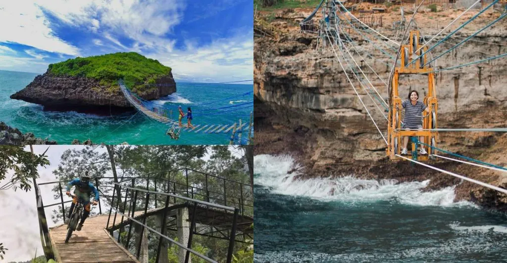 Wisata ekstrim yang ditawarkan di sini adalah meniti jembatan gantung yang memanjang sekitar 40 meter, yang menyatukan dua bukit. Jembatannya selalu bergoyang mengikuti hembusan angin kencang. Ombak tak luput menggoda dengan hantaman kerasnya ke karang. Apalagi kalau kamu datang saat air pasang, ombak bisa saja menembus jembatan dan mengombang-ambingkan susunan kayu dan tali yang menghubungkan daratan. Tertarik merasakan sensasinya?