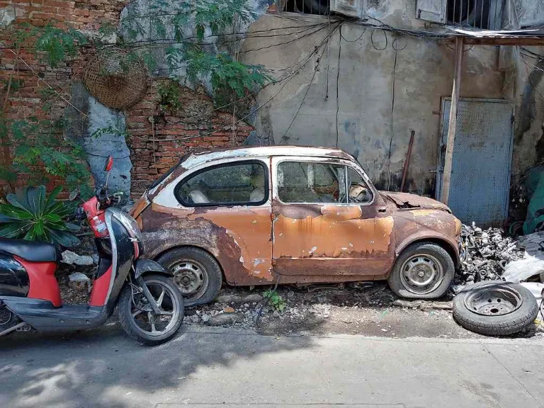 Turtle car, demikianlah julukan untuk Fiat 500 tua di Talat Noi ini. Biar tua, namun mobil ini jadi atraksi yang menarik banyak turis untuk melihatnya. Justru sisi yang berkarat menjadikan mobil ini satu-satunya dan menambah warna di jalanan tersebut. Bahkan kafe yang berdekatan pun jadi terlihat nyeni karena adanya mobil ini.